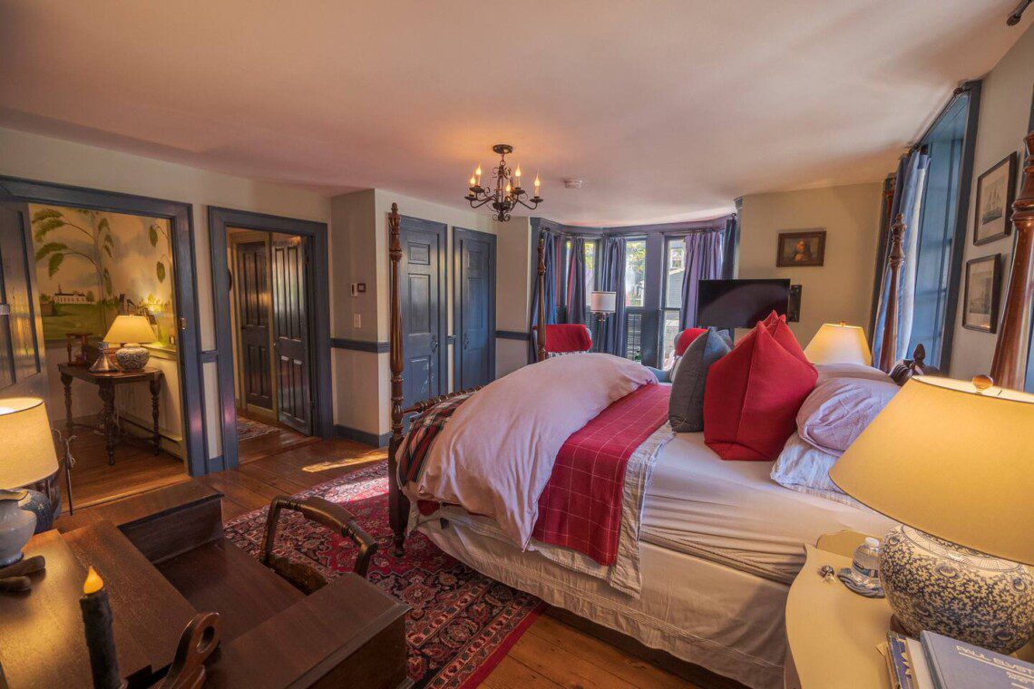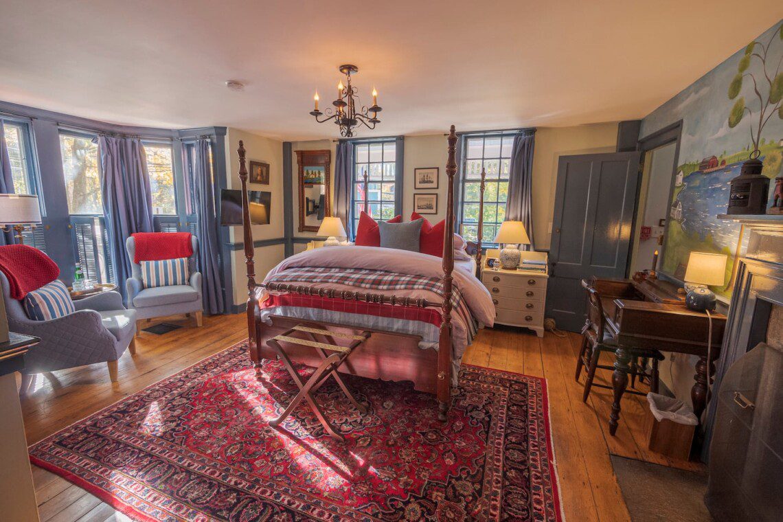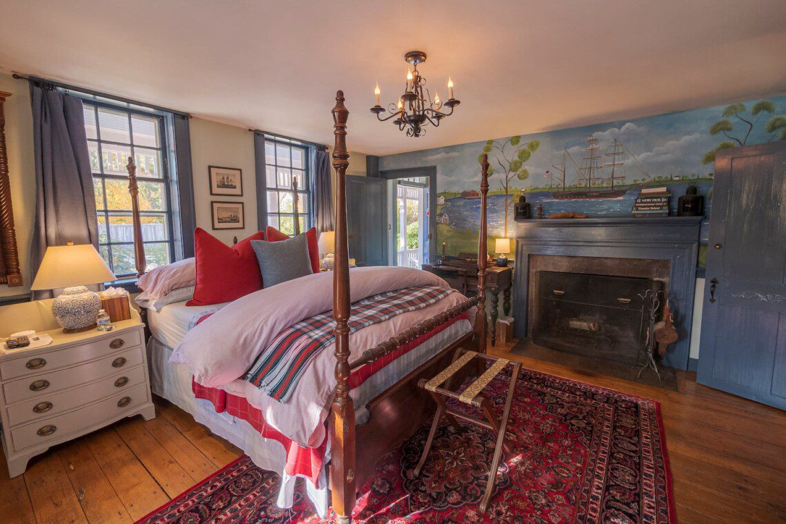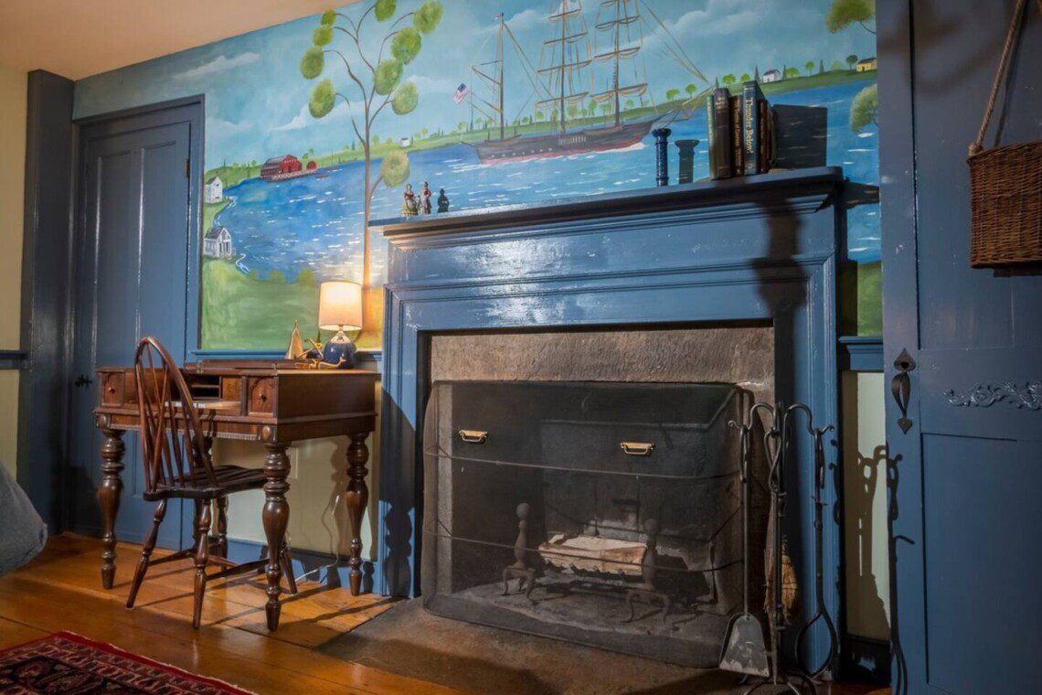 The Charles Morgan Guest Room at the historic Denison Home is a treat to behold~ located in the hamlet of Old Mystic near the head of the Mystic River, this charming room with ensuite bath is a cozy retreat. You’ll fall in love with the amazingly comfy bed and be enchanted by the whimsical nautical mural. A romantic settee, warm colors, and a fireplace are waiting for your arrival! You’ll love all the special nautical touches lovingly set in place! We invite you to stay~ let us look after you!