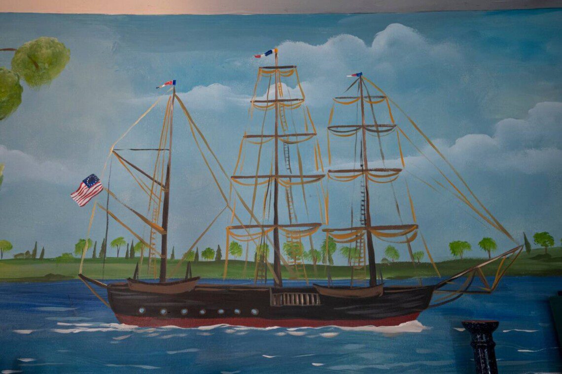 * Whimsical nautical murals by artist Susan Leach grace the walls of the Keeping Room, and each Guest Room, depicting Mystic history and the vessels the rooms are named after.