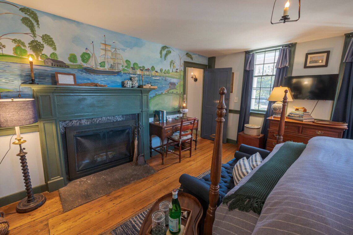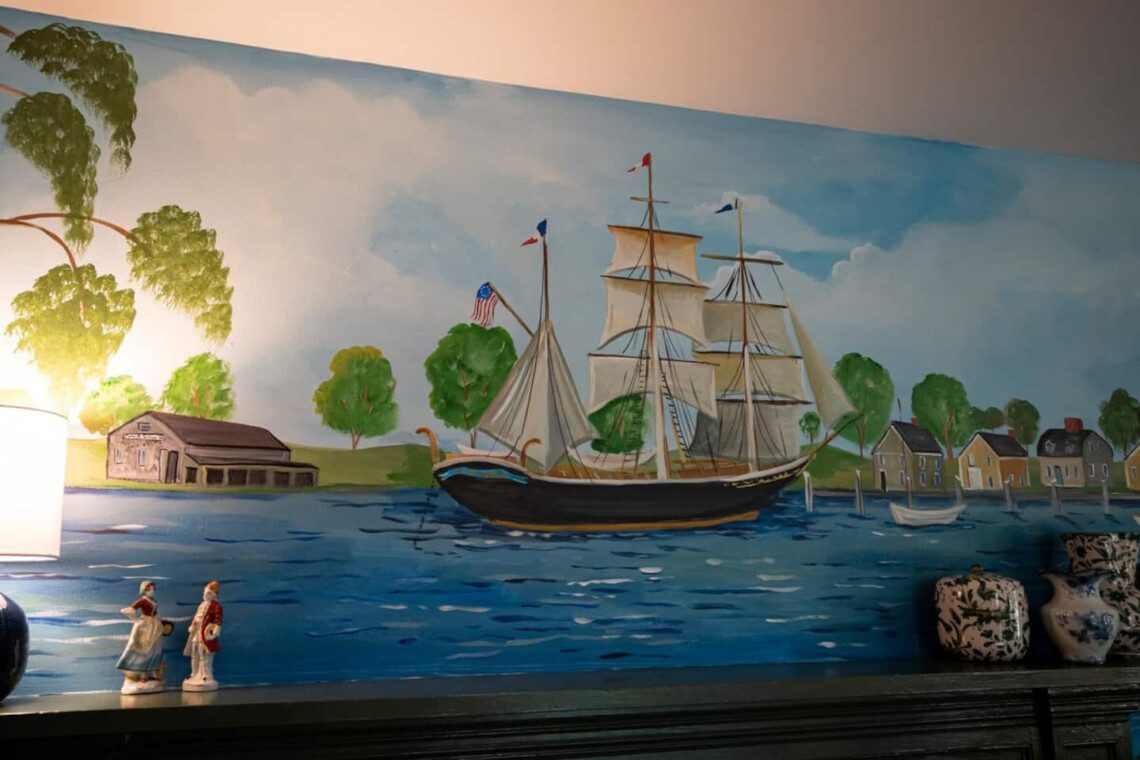 * Whimsical nautical murals by artist Susan Leach grace the walls of the Keeping Room, and each Guest Room, depicting Mystic history and the vessels the rooms are named after.