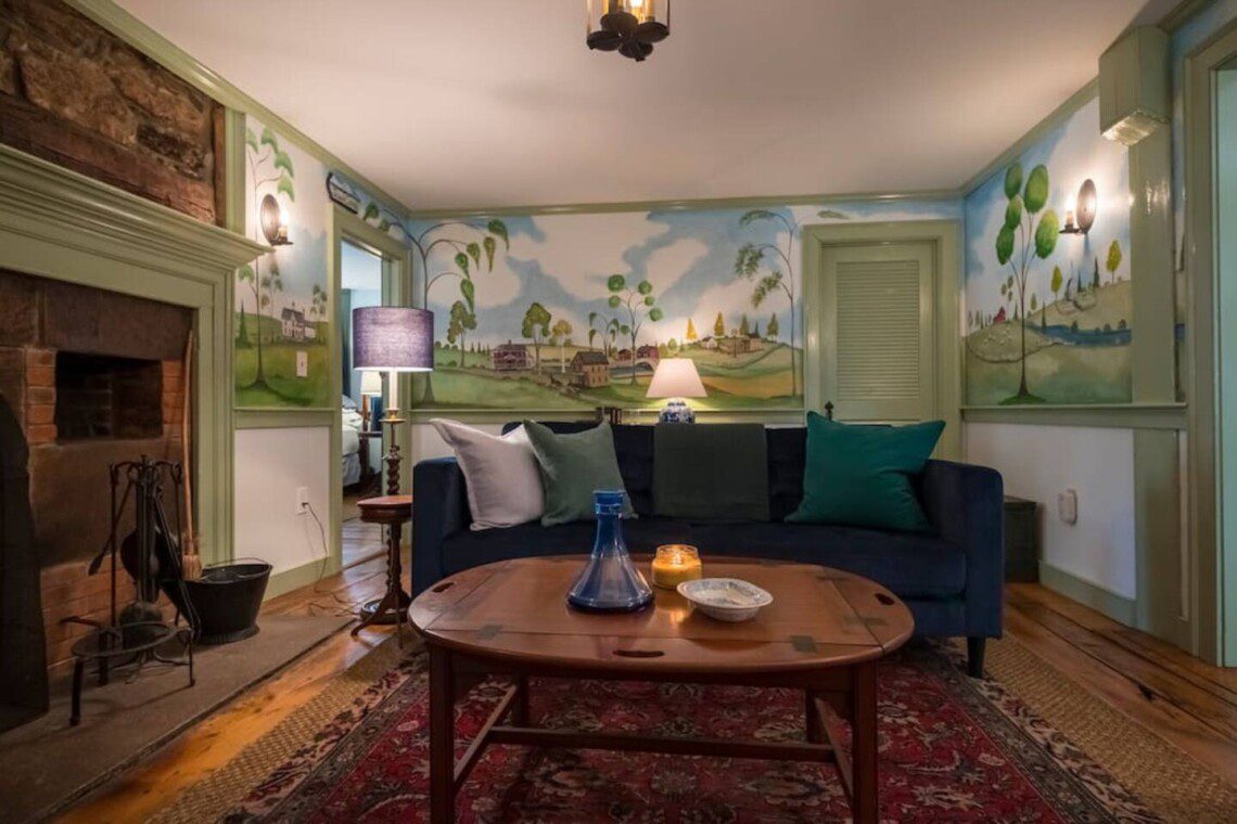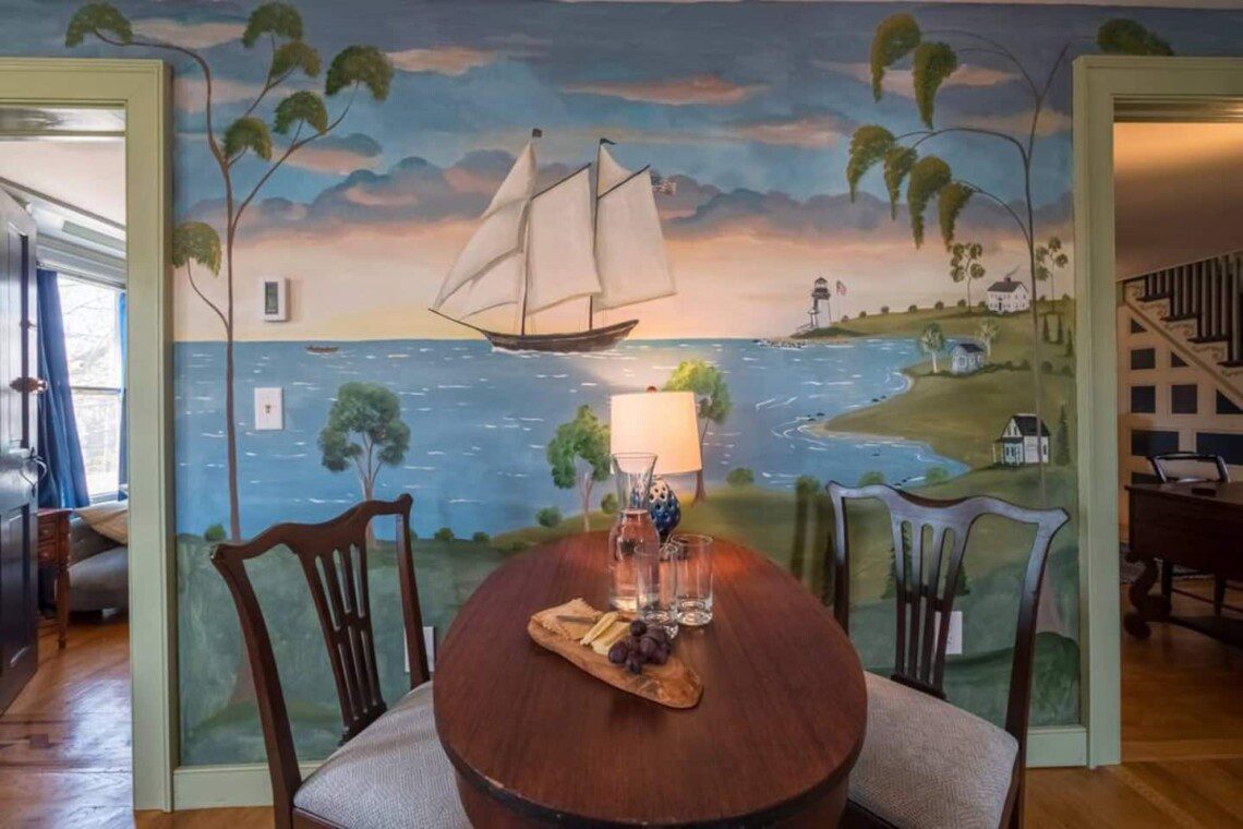 *  Whimsical nautical murals by artist Susan Leach grace the walls of the Keeping Room, and each Guest Room, depicting  Mystic history and the vessels the rooms are named after.