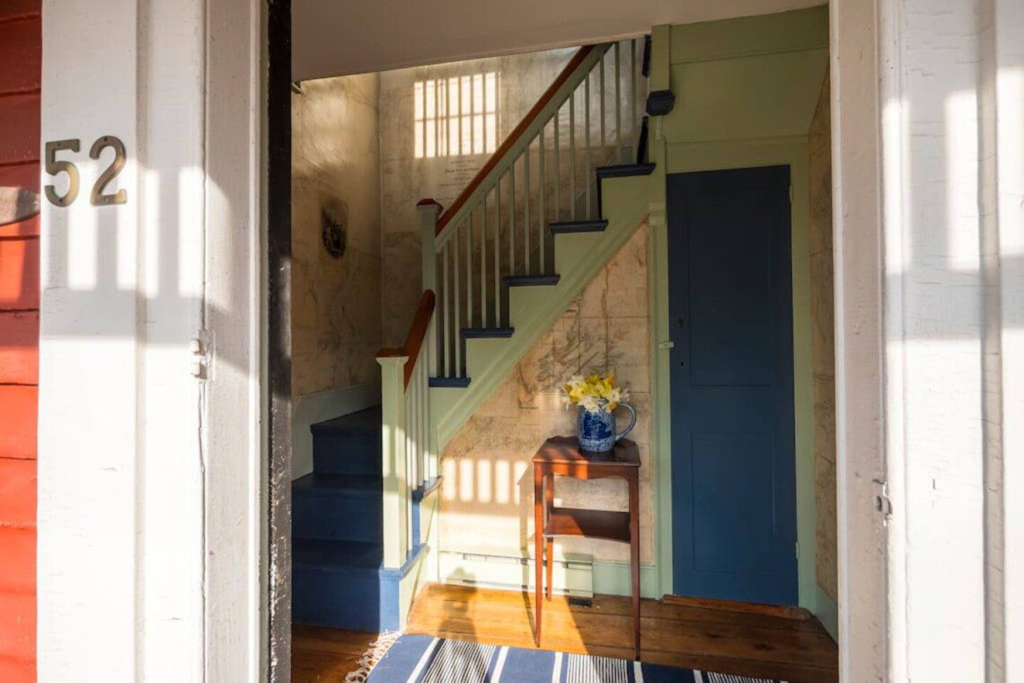 The front stairwell leading up to the Sabino and the Emma C. Berry Guest Rooms is narrow and typical of an antique colonial home of this period (think of the people that have climbed those stairs!)
