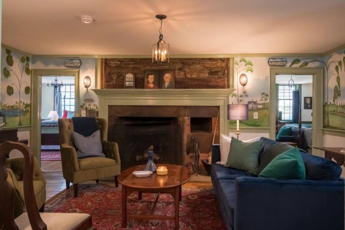 Discover the magic at the 1784 Denison Home LA Dunton Guest Room in the heart and hamlet of Old Mystic~ a breezy 3-mi drive to Mystic Seaport Museum, this historic dwelling beckons you in with its antiques, nautical curiosities, and maritime books. You’ll feel cocooned in a plush king-size bed, greeted by a dawn mural, and pampered by the comforts and privacy of an ensuite bath, your own balcony, and entrance. You’ll love to sip wine down in the Keeping Room and relax in the maritime library!