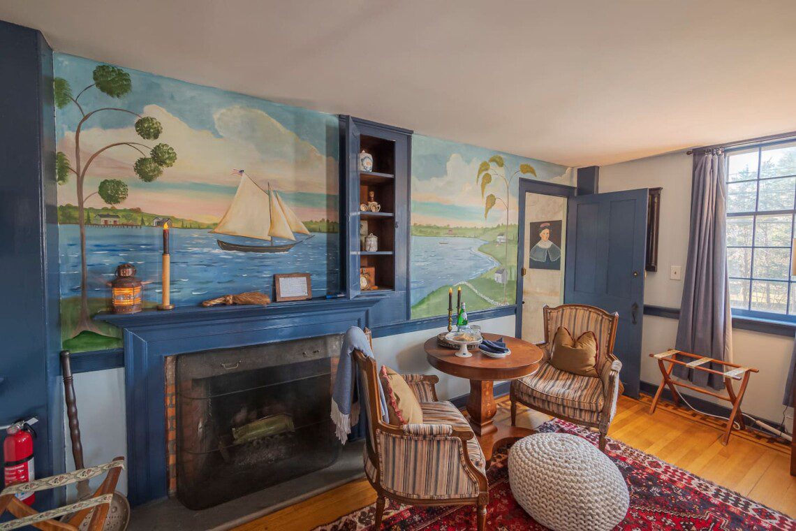 * Whimsical nautical murals by artist Susan Leach grace the walls of the Keeping Room, and each Guest Room, depicting * Mystic history and the vessels the rooms are named after.