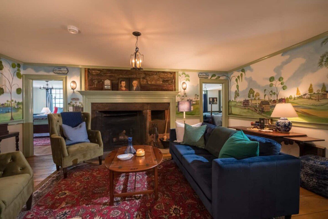 An intimate room for gathering and connecting featuring a historic working wood-burning beehive oven, panoramic mural by artist, Susan Leach, Sonos speaker, and board games.