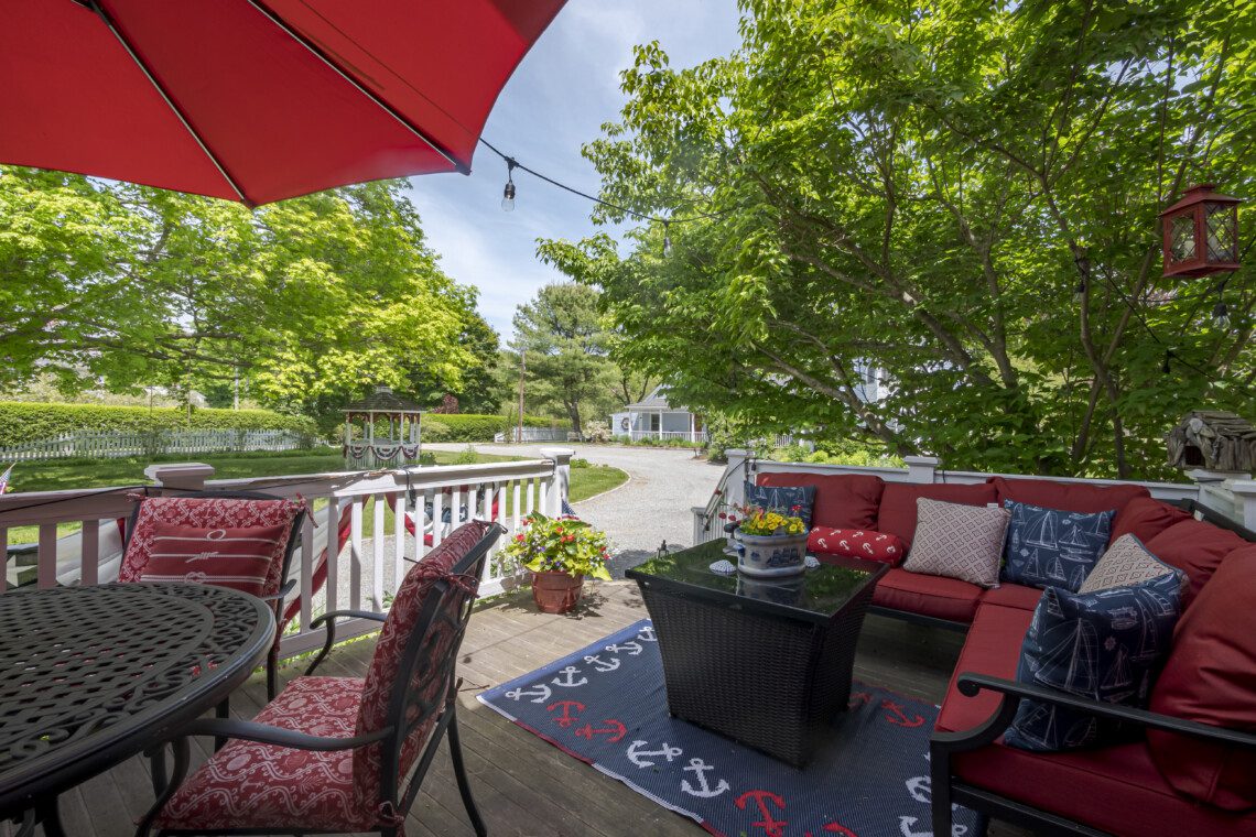 — Covered porch at the Carriage House with small tables